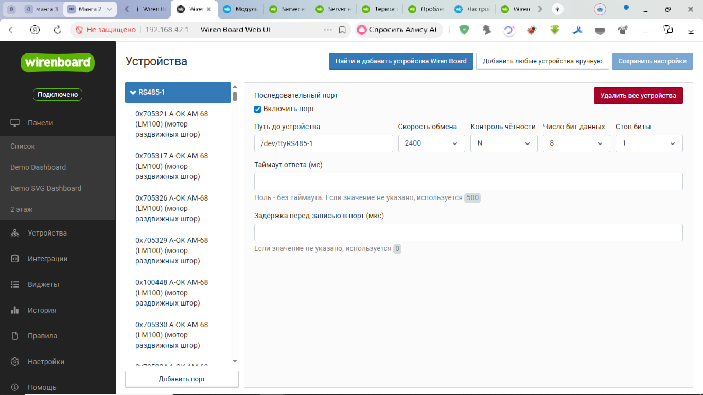 На ttyRS485-1 подключен Разветвитель шины RS-485 WB-BUSHUB из него идет 6 линий на одной линии 4 карниза A-ok-68, таких линий 2 шт на остальных по 2 карниза A-ok-68. всего 16 карнизов. ошибка возникает при прописке одного карниза как описывал выше