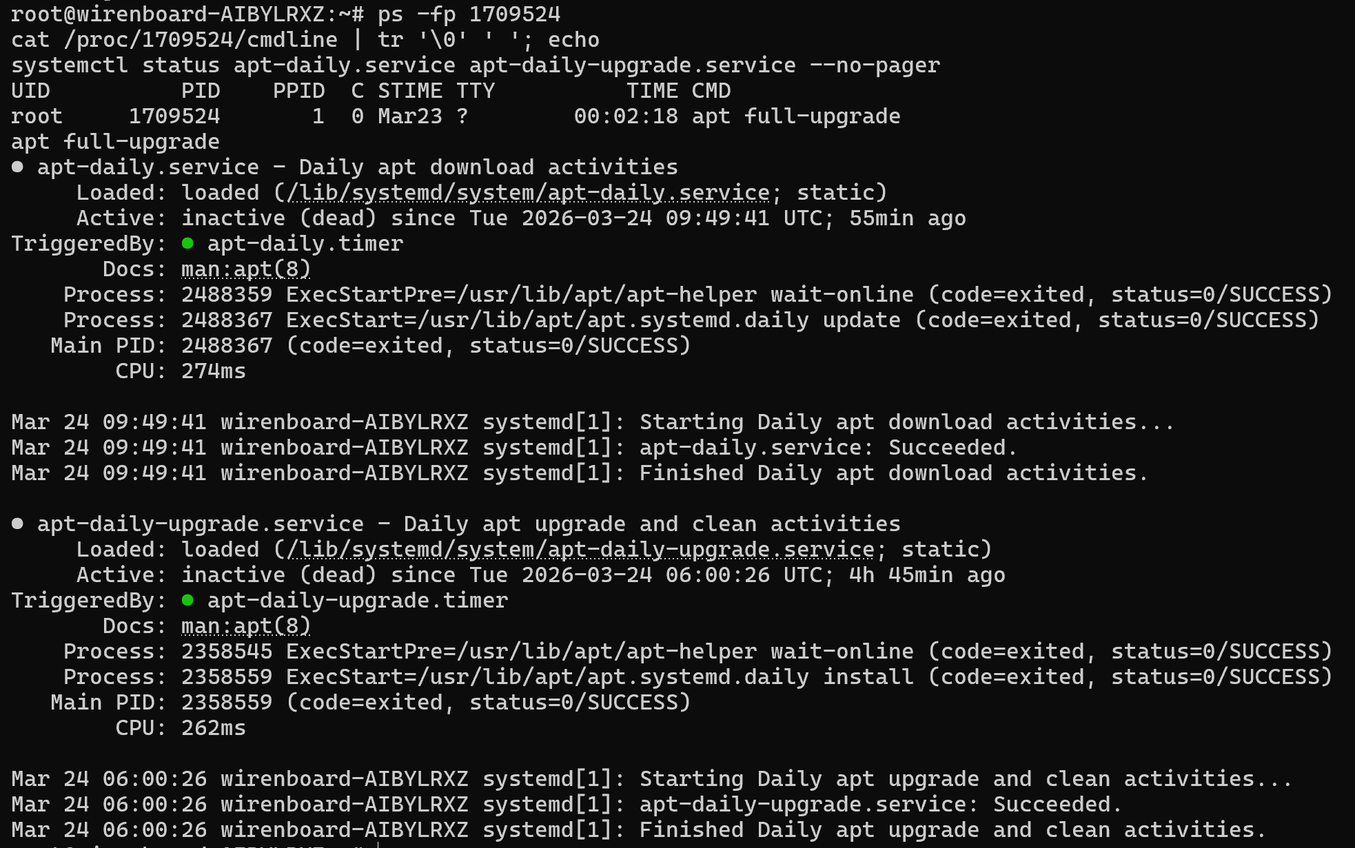 systemctl status apt-daily.service apt-daily-upgrade.service --no-pager