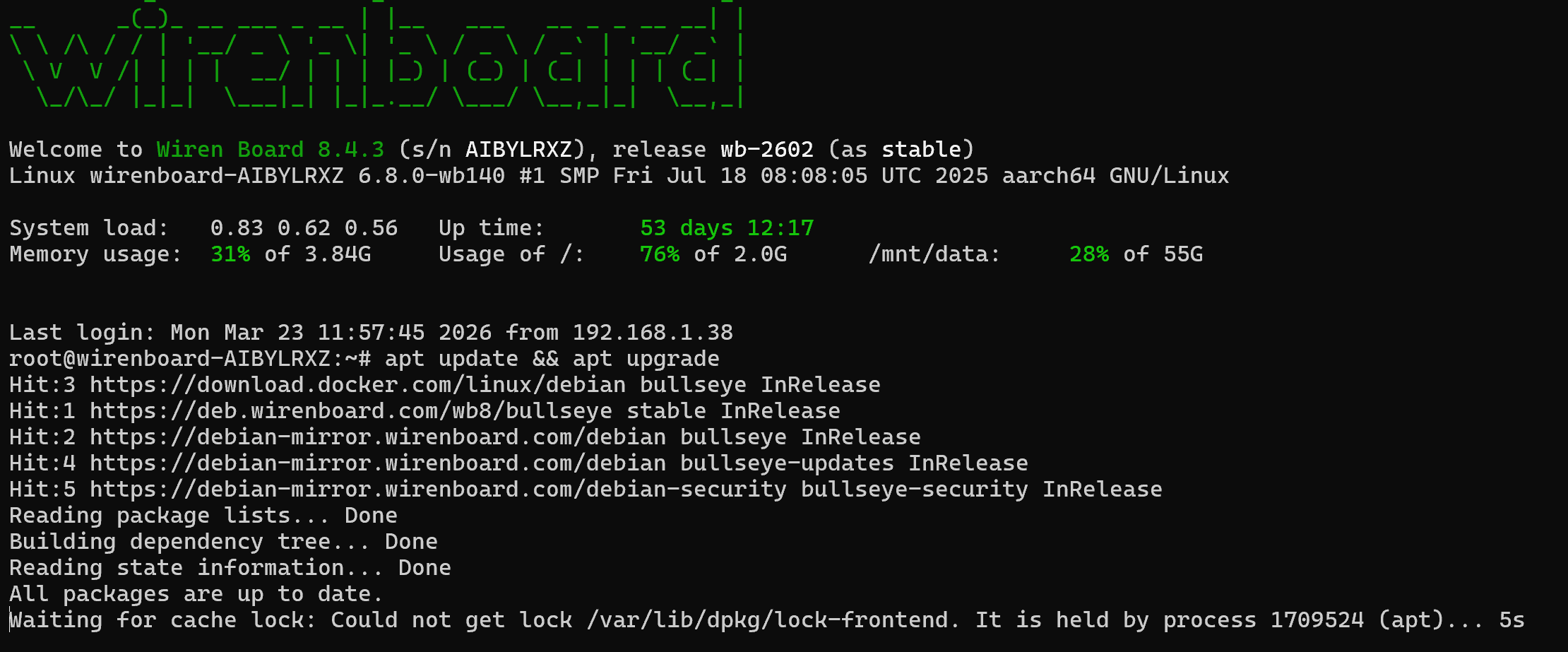 Если видно, что обновление реально ещё идёт, просто дождитесь завершения. Если процесс висит очень долго и ничего не делает, самый безопасный вариант — перезагрузить контроллер, а не удалять lock-файлы вручную: