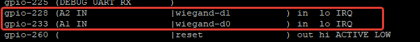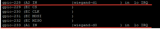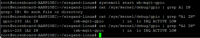 Здравствуйте, пытаюсь подключить считыватель Matrix II к WB 8.5 по протоколу wiegand 26. Скомпилировал модуль ядра GitHub - wirenboard/wiegand-linux: Linux driver for reading wiegand data from GPIO. Tested for ARM 9G20 (linux stamp) Модуль успешно загружается. D0 считывателя подключен к A1 в режиме входа, D1 считывателя к A2 контроллера. Использую номера gpio 233 и 228 соответственно. Входное напряжение контроллера 12 В, на входах 4.6 В. Карта считывается, но на входы номер карты не передаётся.