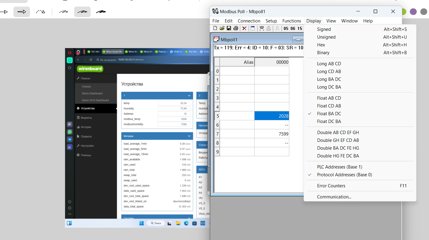 Проверяю и через modbus32 и через modbus poll показания примерно одинаковые…получается что WB криво отправляет…но когда в настройках шлюза устанавливаю знаковое число…показание температуры приходят норм, но только соответственно целая часть
