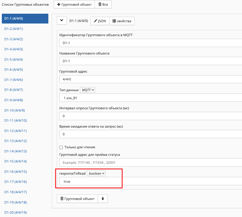 наша ситуация в том что есть визуальные панели управления. и например при первом запуске этой панели или при сбое по питанию она отправляет в ГА - GroupValueRead, и объекты которые привязаны к этому ГА и имеют флаг R - отправляют в шину текущее значение. Если вернутся к WB то ожидается что если у WB в wb-mqtt-knx.conf создан объект с ГА и там есть флаг “отвечать на запрос read” то WB может ответить в шину текущим значением. такой флаг я как понял появился: