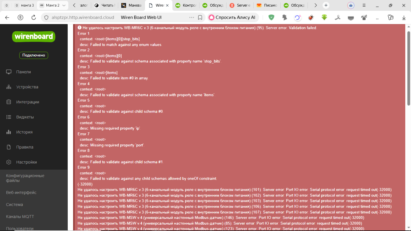 Специалист не может попасть на веб-интерфейс вашего контроллера, хотел попросить вас прислать пароль в личные сообщения мне или временно поменять на, скажем, wirenboard.