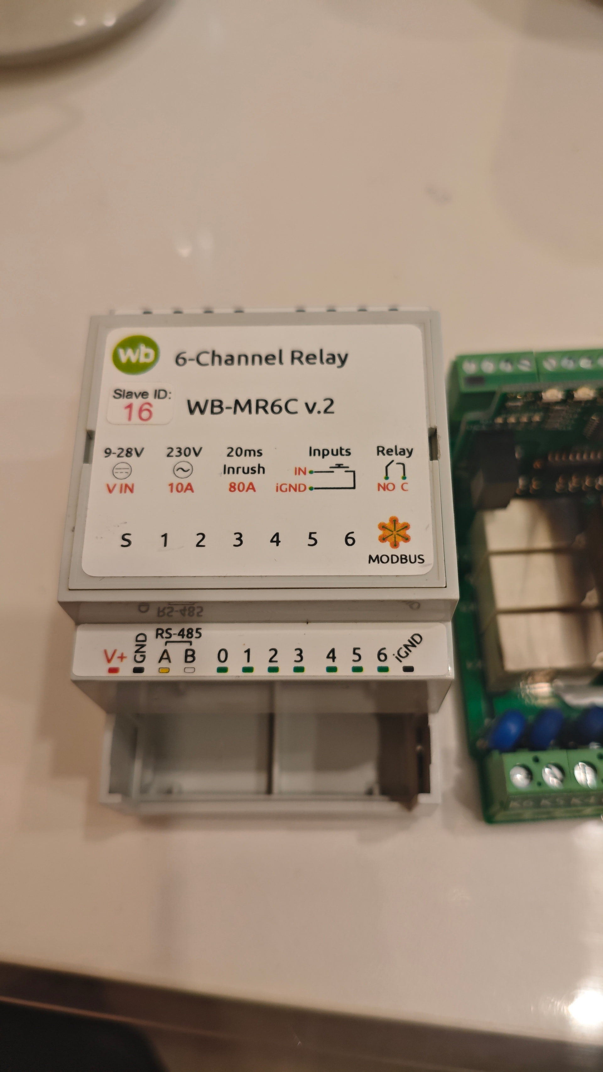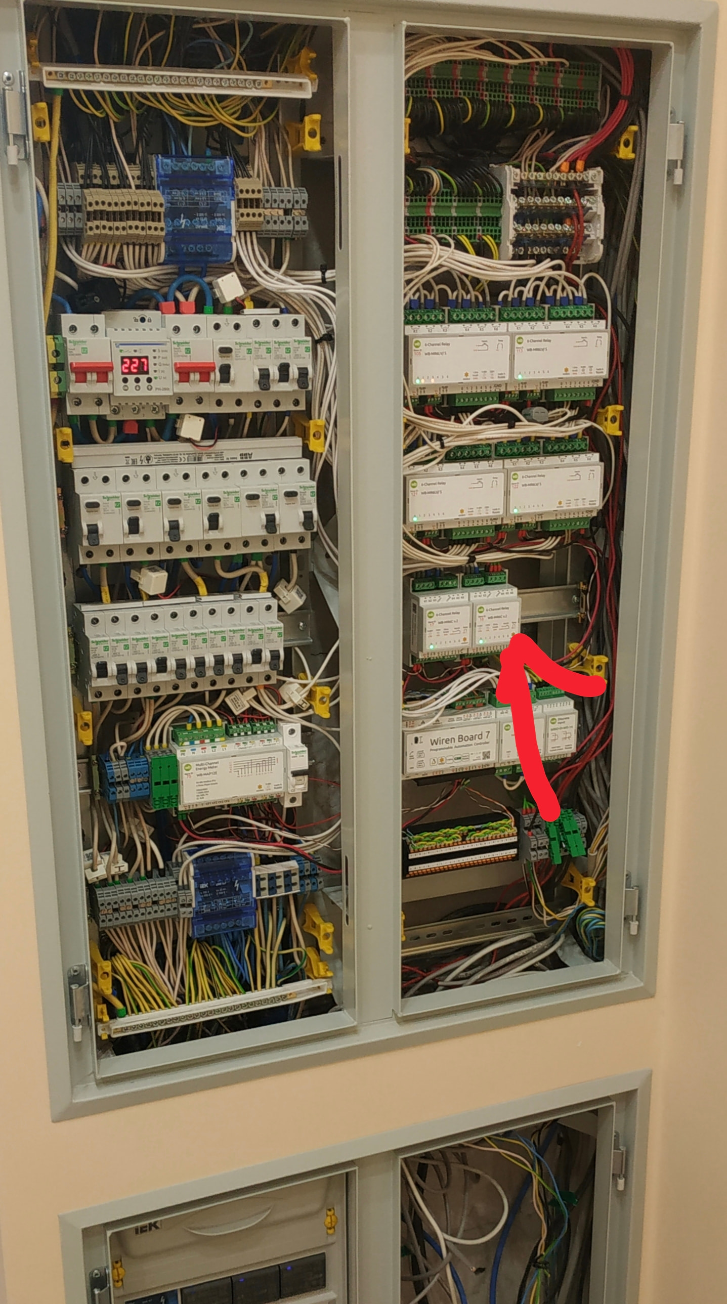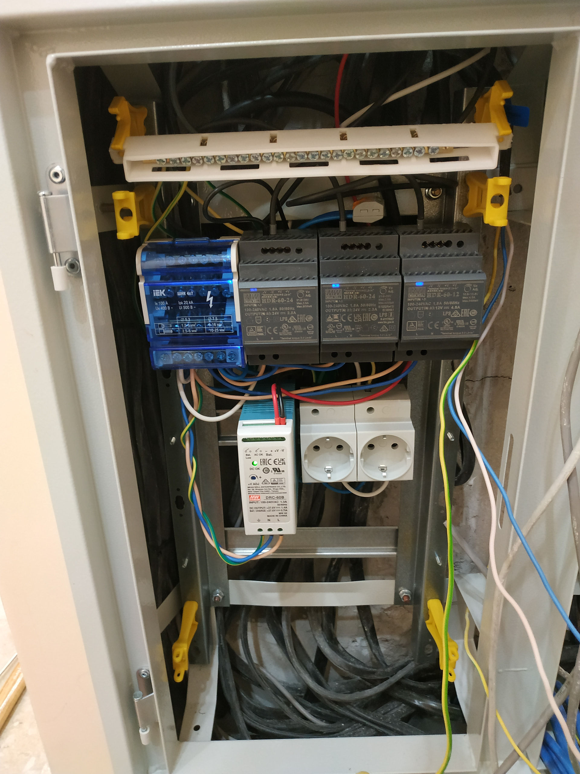 Мощных нагрузок на той же линии питания нет, от того же ПМ запитаны ещё один модуль MR6C v.2, четыре модуля MR6LV и контроллер wirenboard 7. Фото щита тоже прилагаю не текущие, а с момента сборки и пуска, но с момента сборки там почти ничего не поменялось. Если нужно позже смогу приложить актуальные.