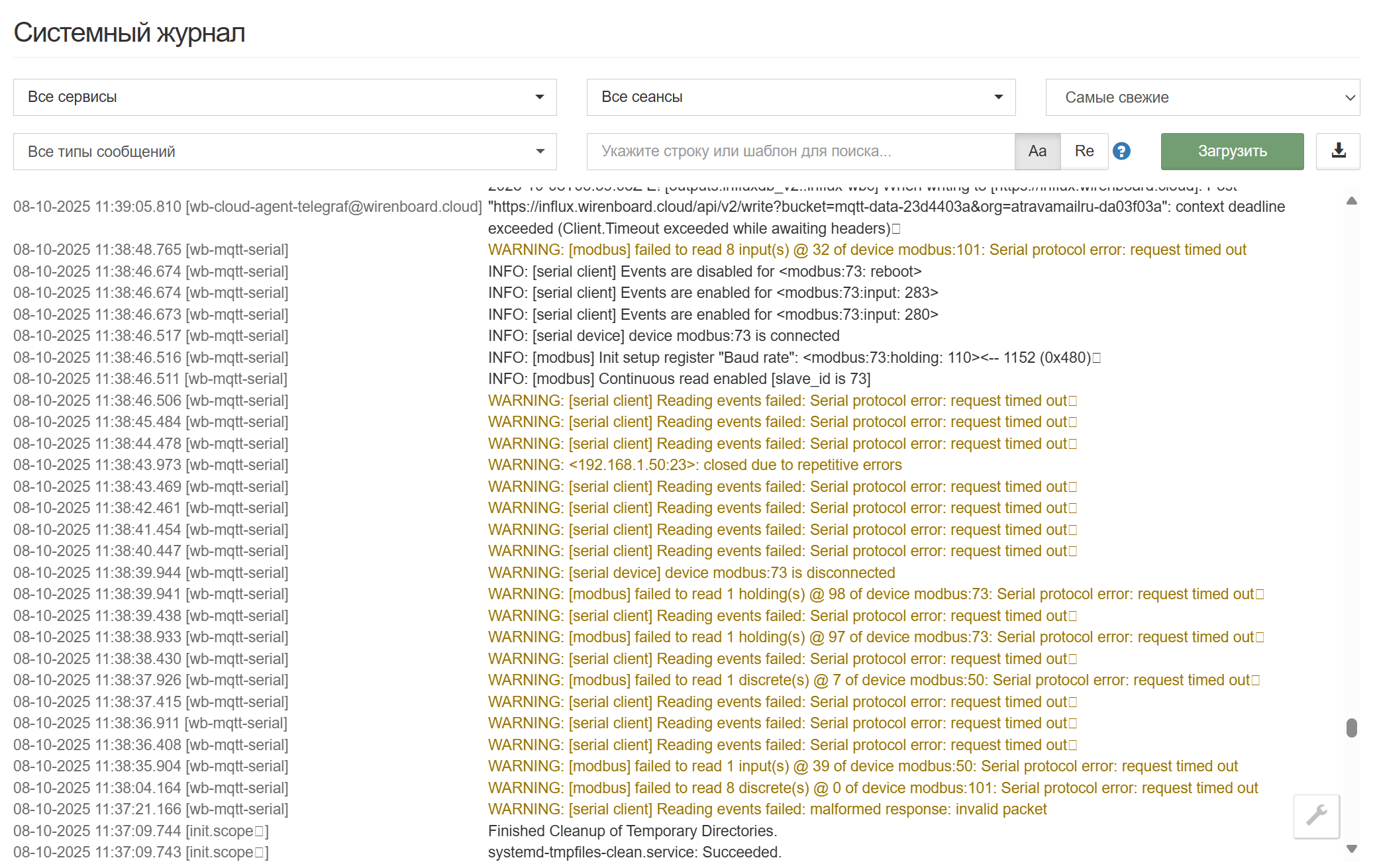 Oct 08 06:11:55 wirenboard-APIXVELT wb-mqtt-serial[1755]: ERROR: [serial client] Serial protocol error: <192.168.1.53:23> connect error: timeout