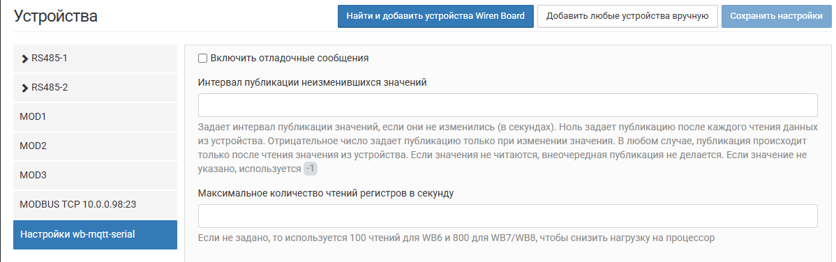 Здравствуйте. Благодарю за ожидание. Для сервиса wb-mqtt-serial можете, например, задать значения ограничения записи (установить выше дефолтных):