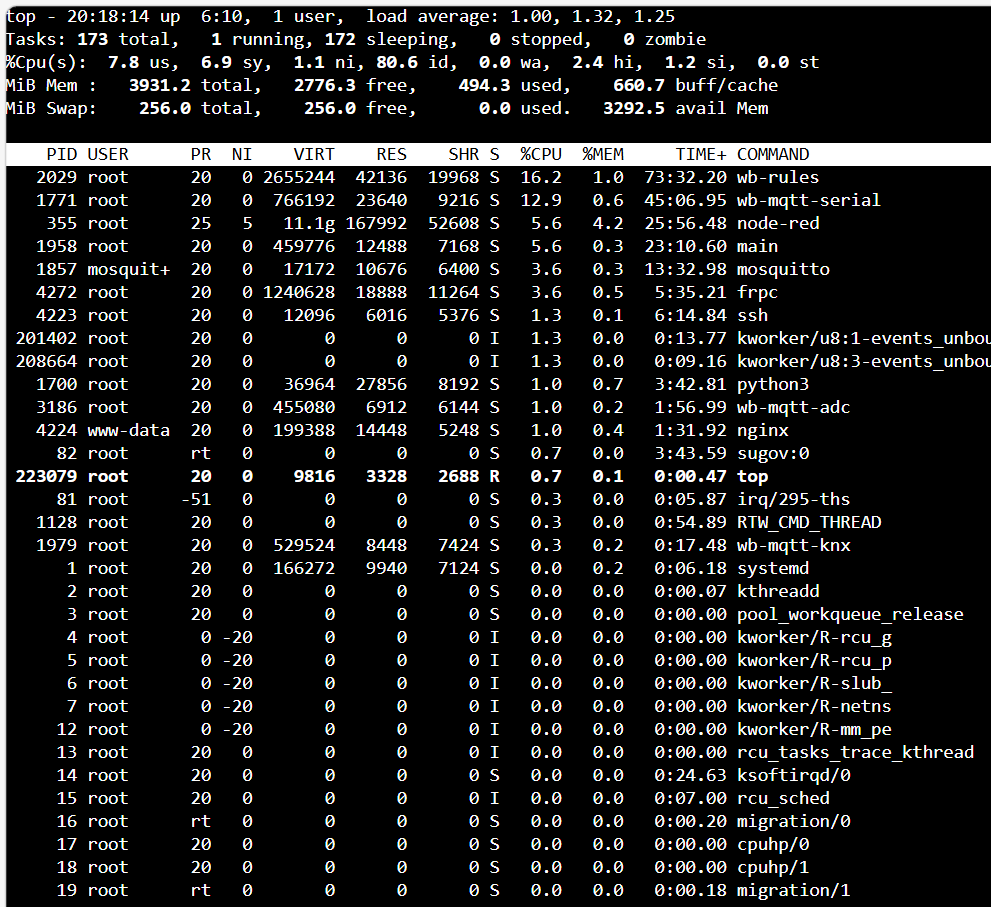 изначально началось все с того что после написания ряда правил в движке, обратил внимание на высокую загрузку CPU. При выявлении основного источника выявлено, что сервис wb-rules загружал от 30% до 45 % CPU. Оптимизировал правила, сокращение сообщений по правилам снизил с 1800-2000 сообщениq в секунду до 300 (максимально). Пока не разобрался как принудительно ограничить публикацию сообщений в mqtt от модулей WB.