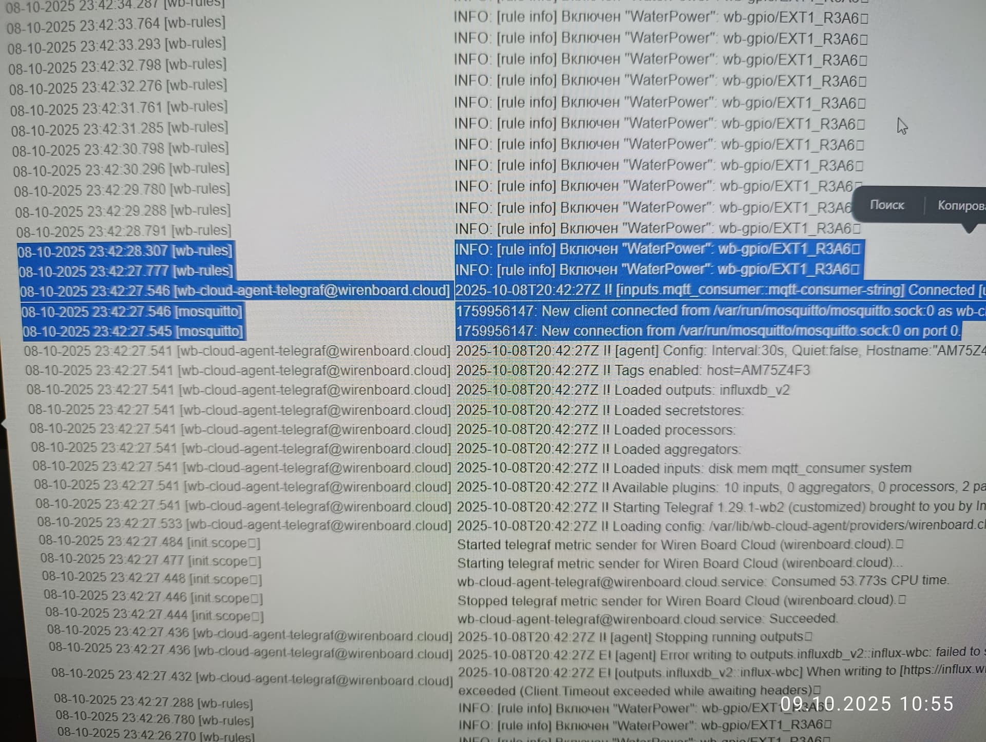 В 23.42.14 попытка записать 1 в дискретный выход, она не удалась, процесс зациклился. Через некоторое время что-то там Москито поругался.
