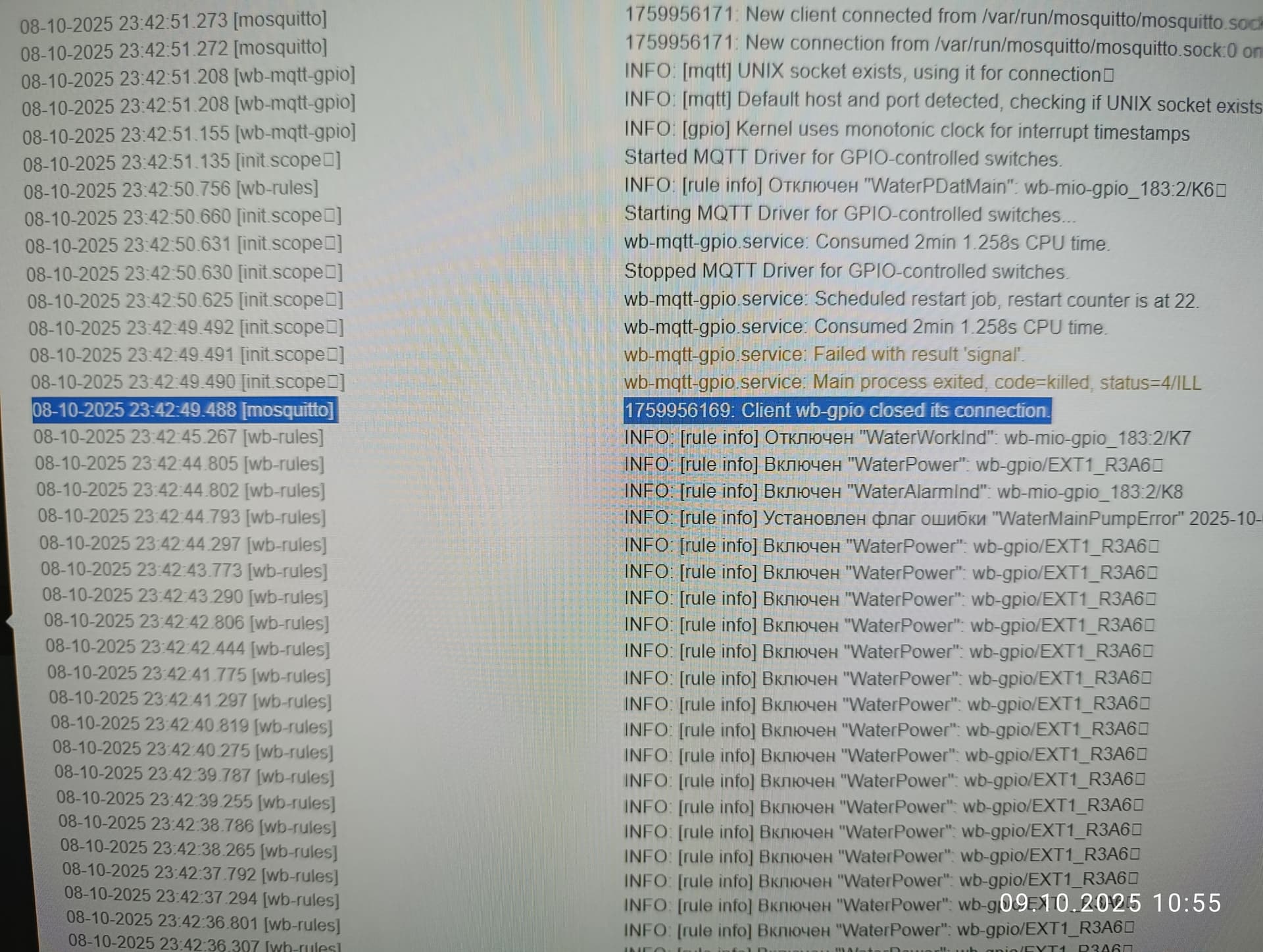 С другой стороны я наблюдаю что в этот период времени, который вы проиллюстрировали скриншотами, у вас падает и перезапускается wb-mqtt-gpio: wb-mqtt-gpio.service: Main process exited, code=killed, status=4/ILL. Тут я не вижу совпадений по времени с “NAK bailout”, правда.