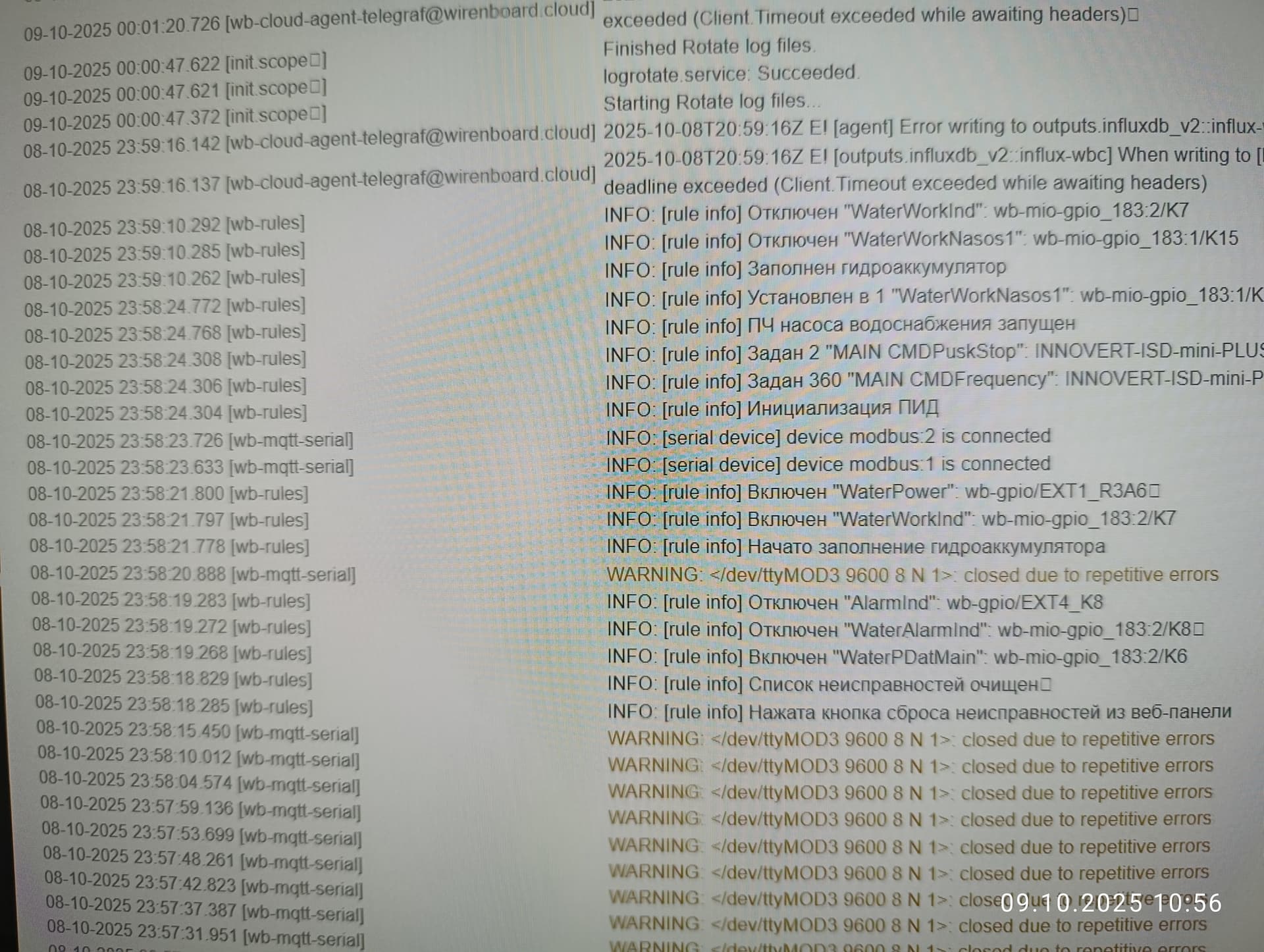 Пока не увидел каких-то конкретных ошибок, связанных с тем поведением, что вы описываете, но заметил, что очень много ошибок при обмене данными на портах /dev/ttyMOD3 и /dev/ttyRS485-1.