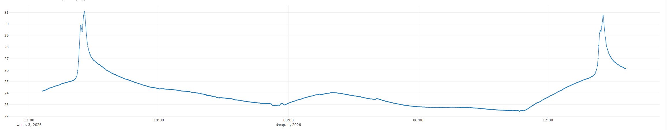 Здравствуйте, ежедневно на протяжение как минимум недели (раньше не проверял и не обращал внимания), наблюдаю скачки температуры у датчика WB-MSW v.4. Они происходят примерно в одно и то же время (по графику вплоть до секунд). В чем может быть проблема и что делать с этим?