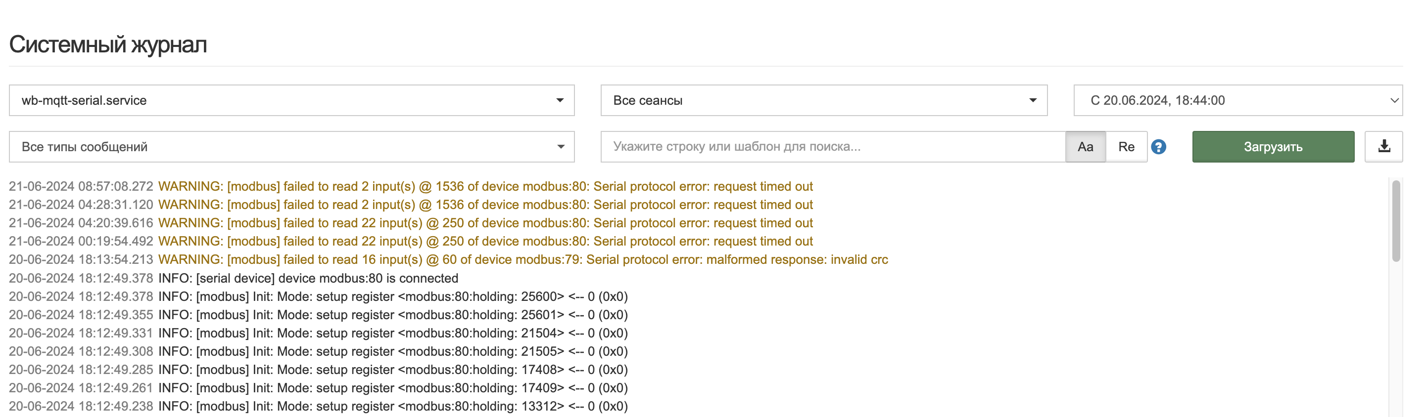 А вот если устройство удачно получило запрос но его ответ получен контроллером с ошибкой - как раз и будет запись в лог “invalid CRC”/