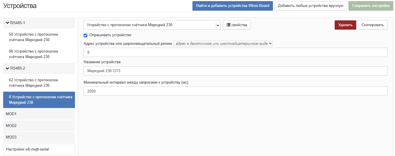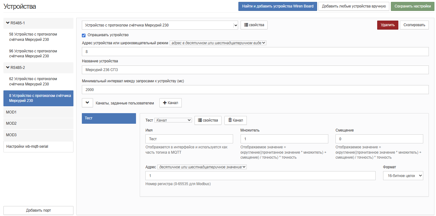 При добавлении нового устройства с протоколом счетчика Меркурий 230 мы просто получаем пустую виджет заглушку, подразумевалось что все каналы обнаружатся автоматически. Далее если для теста самим создать канал например с регистром 1, то данные начинаю считываться. Не хотелось бы у всех счётчиков прописывать каналы вручную. В чём может быть проблема автоматического обнаружения каналов? Игрался с разными настройками, но результата нет.