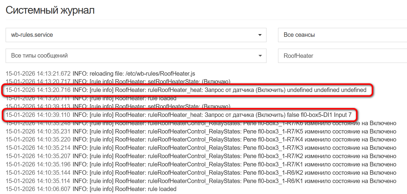 log(“RoofHeater: ruleRoofHeaterControl_RelayStates: Реле {}/{} изменило состояние на {}”,devName, cellName, (newValue)?“Включено”:“Выключено” );