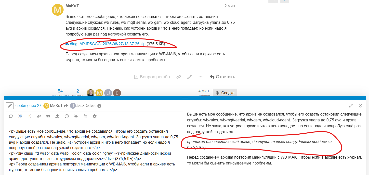Выше есть мое сообщение, что архив не создавался, чтобы его создать остановил следующие службы: wb-rules, wb-mqtt-serial, wb-gsm, wb-cloud-agent. Загрузка упала до 0,75 avg и архив создался. Не знаю, как устроен архив и что в него попадает, но если надо я попробую ещё раз под нагрузкой создать его. Перед созданием архива повторил манипуляции с WB-MAI6, чтобы если в архиве есть журнал, то могли бы оценить описываемые проблемы.