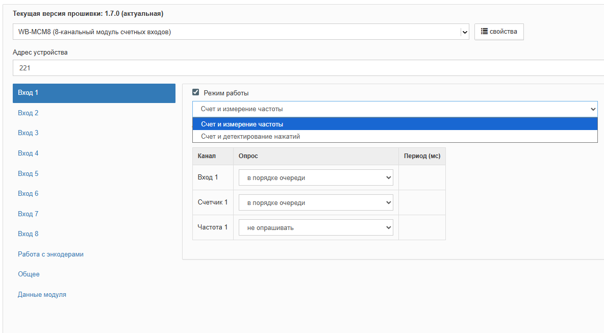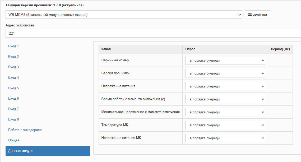 К сожалению, в документации Модуль дискретных и счётных входов WB-MCM8 не нашел информацию.