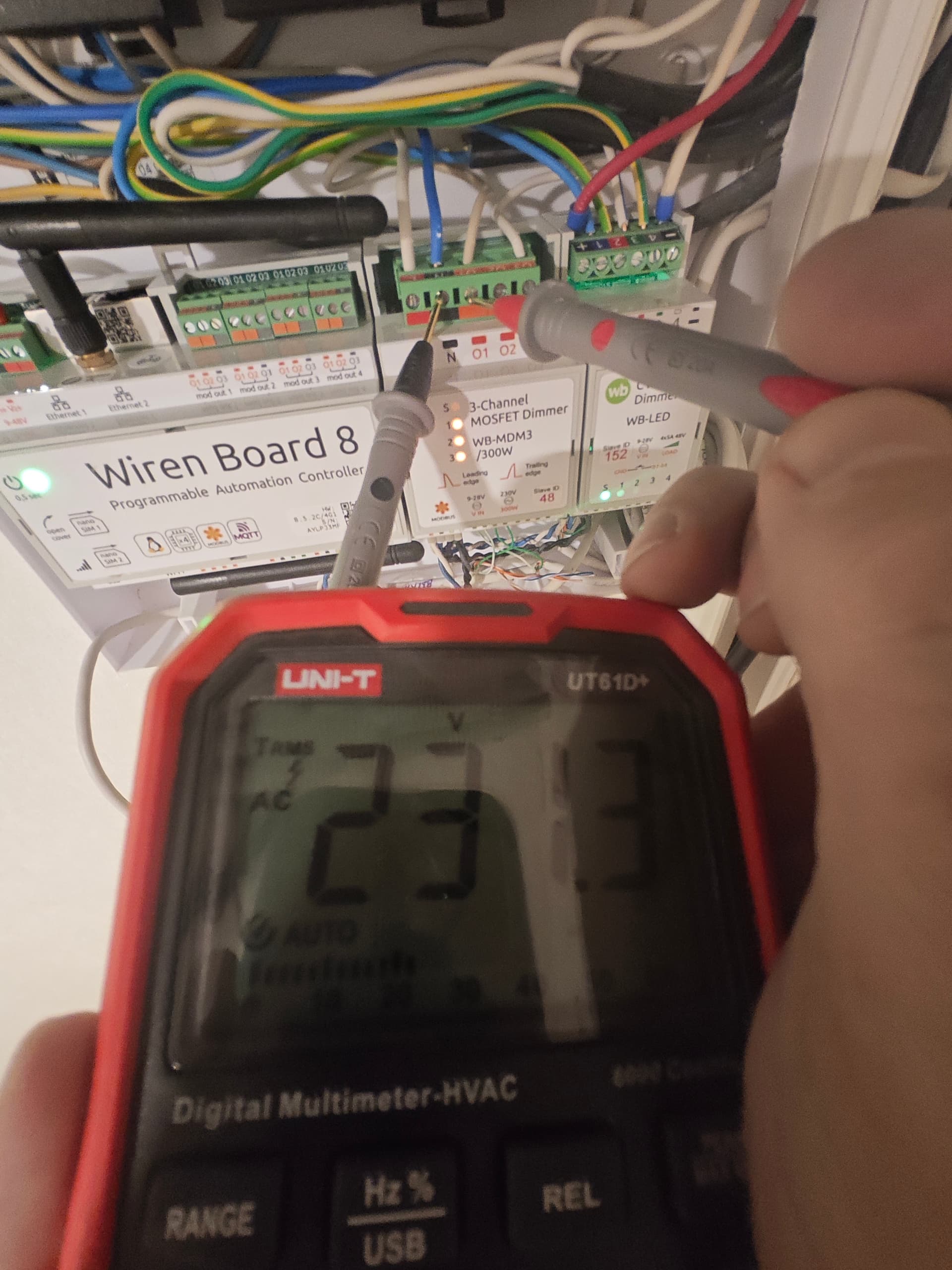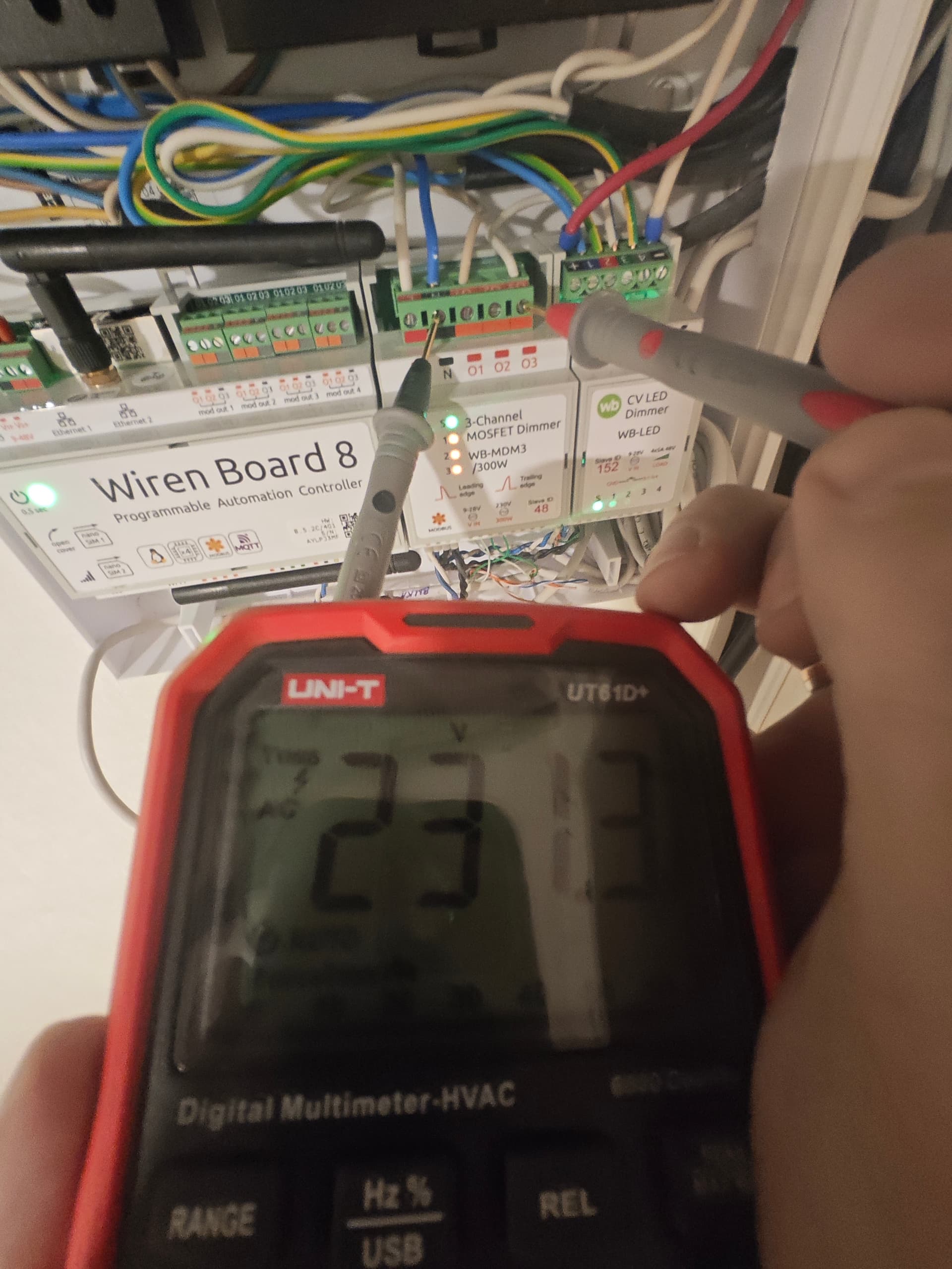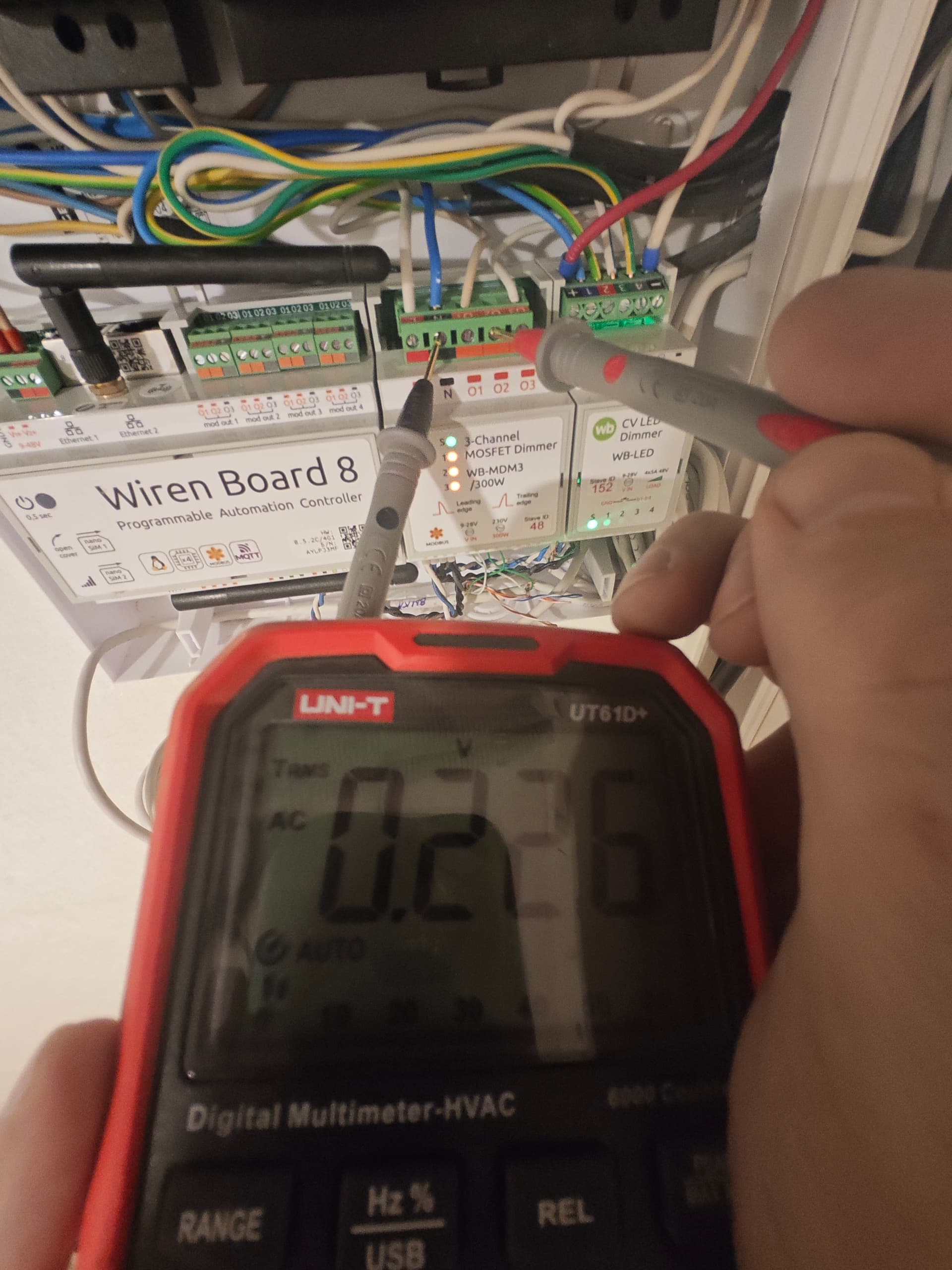 Здравствуйте! Возникла неисправность на WB-MDM3 (№306612) через 4 дня после установки. Нет выходного напряжения на втором канале. Перегорела светодиодная лампа с хлопком, после замены лампы освещение на втором канале не заработало. Напряжении на выдает 0,2v. Остальные два канала работают.