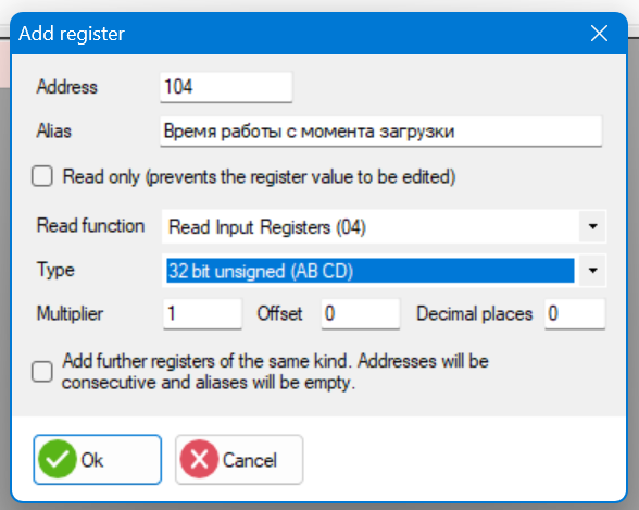 Обратите внимание на функцию и тип регистра. Заполняю согласно карте регистров, т.е.: