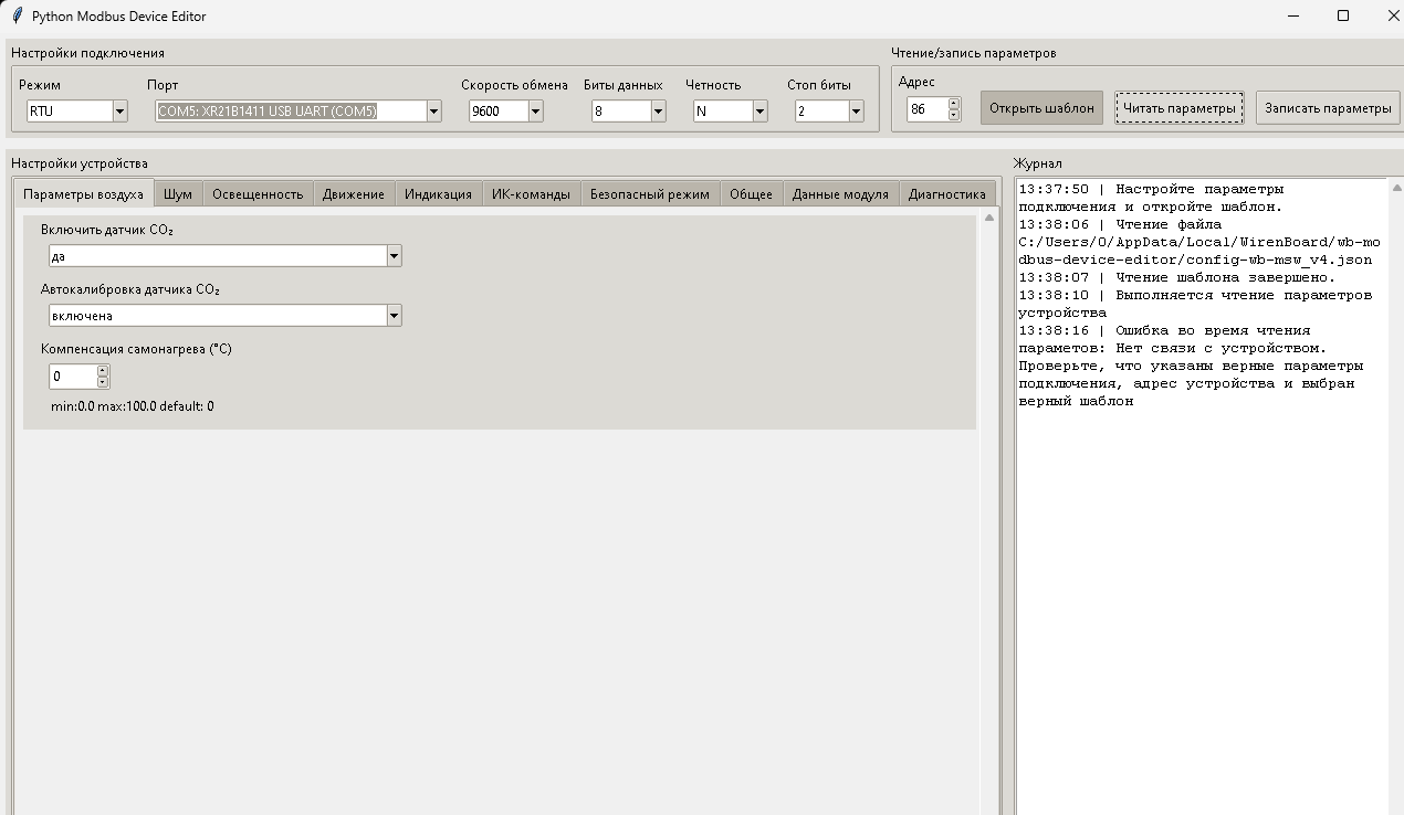 - Используйте лучше ModbusPoll или Rilheva. Поскольку мы больше не поддерживаем wb-modbus-device-editor и появляется ошибка при попытке загрузки шаблона некоторых наших устройств.