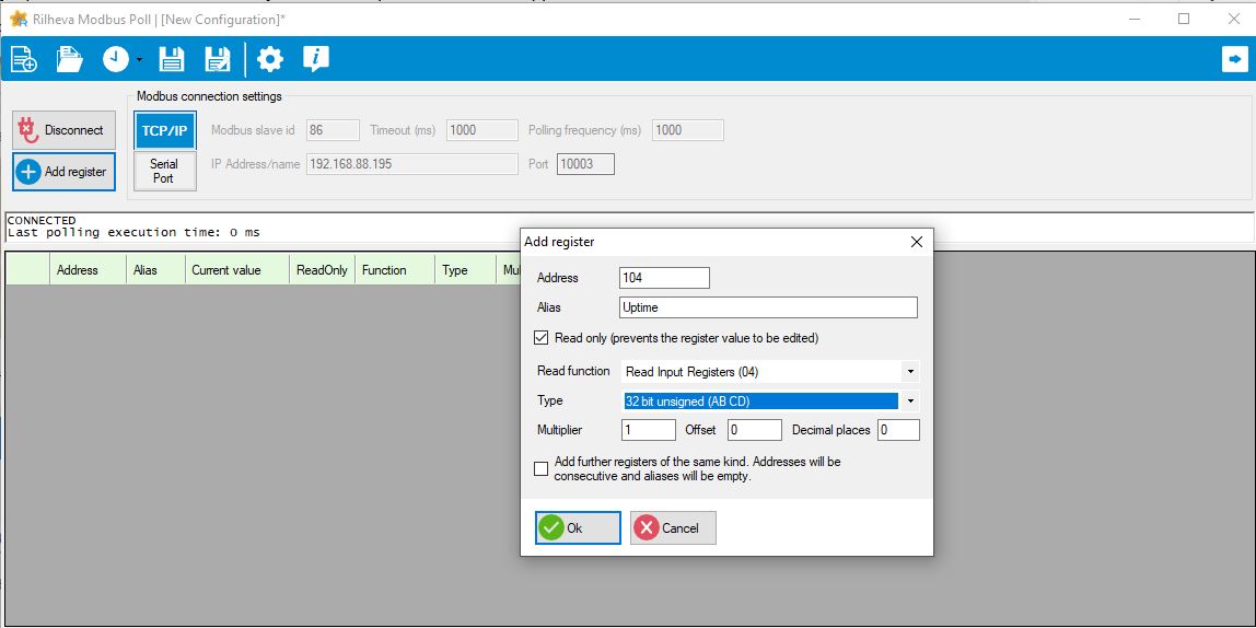 Открываю Rilheva, настраиваю параметры подключения, добавляю регистр для опроса (например, 104-105):