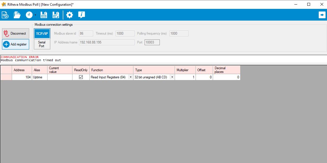 У вас есть другие Modbus устройства, к которым вам удается подключиться и опрашивать регистры?