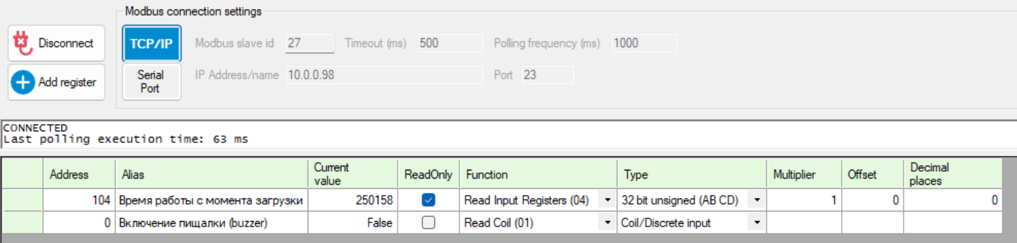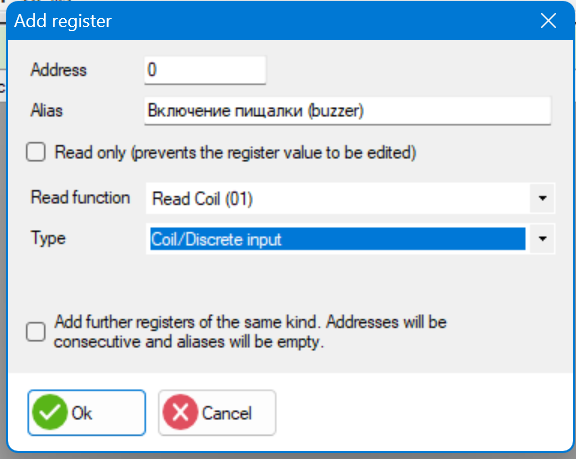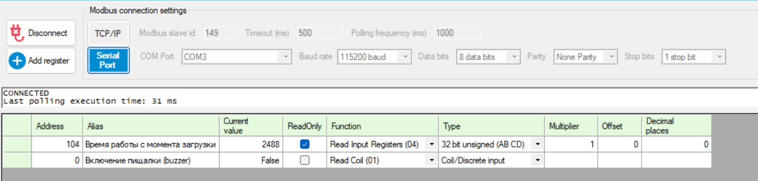 Также, для примера добавляю 0 регистр (Включение пищалки (buzzer)):