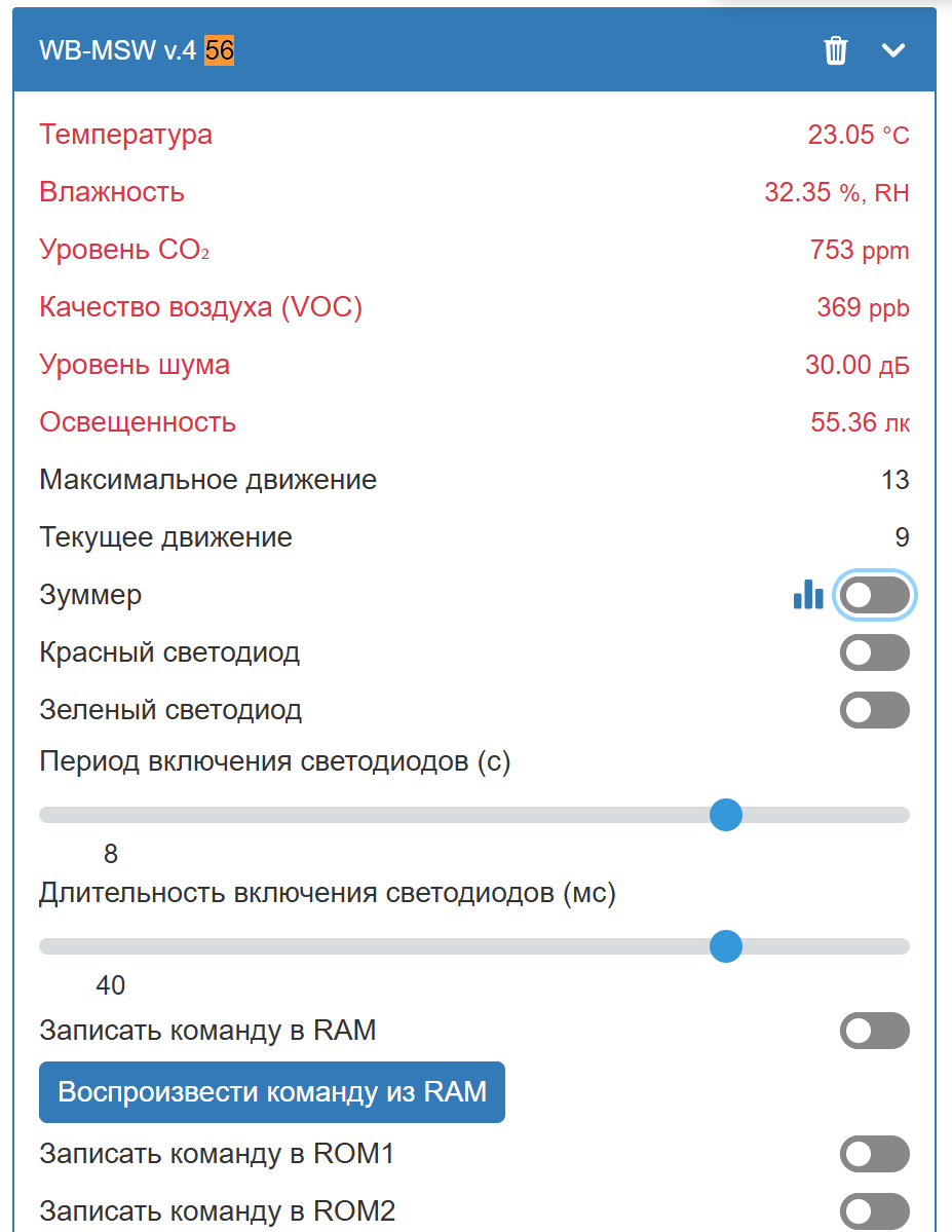 Здравствуйте! Пропали (замерли и покраснели в WEB интерфейсе WB) показания температуры, влажности, VOC, освещенности. При отключении сенсора VOC показания температуры и влажности восстанавливаются (освещенность так и остается красной).