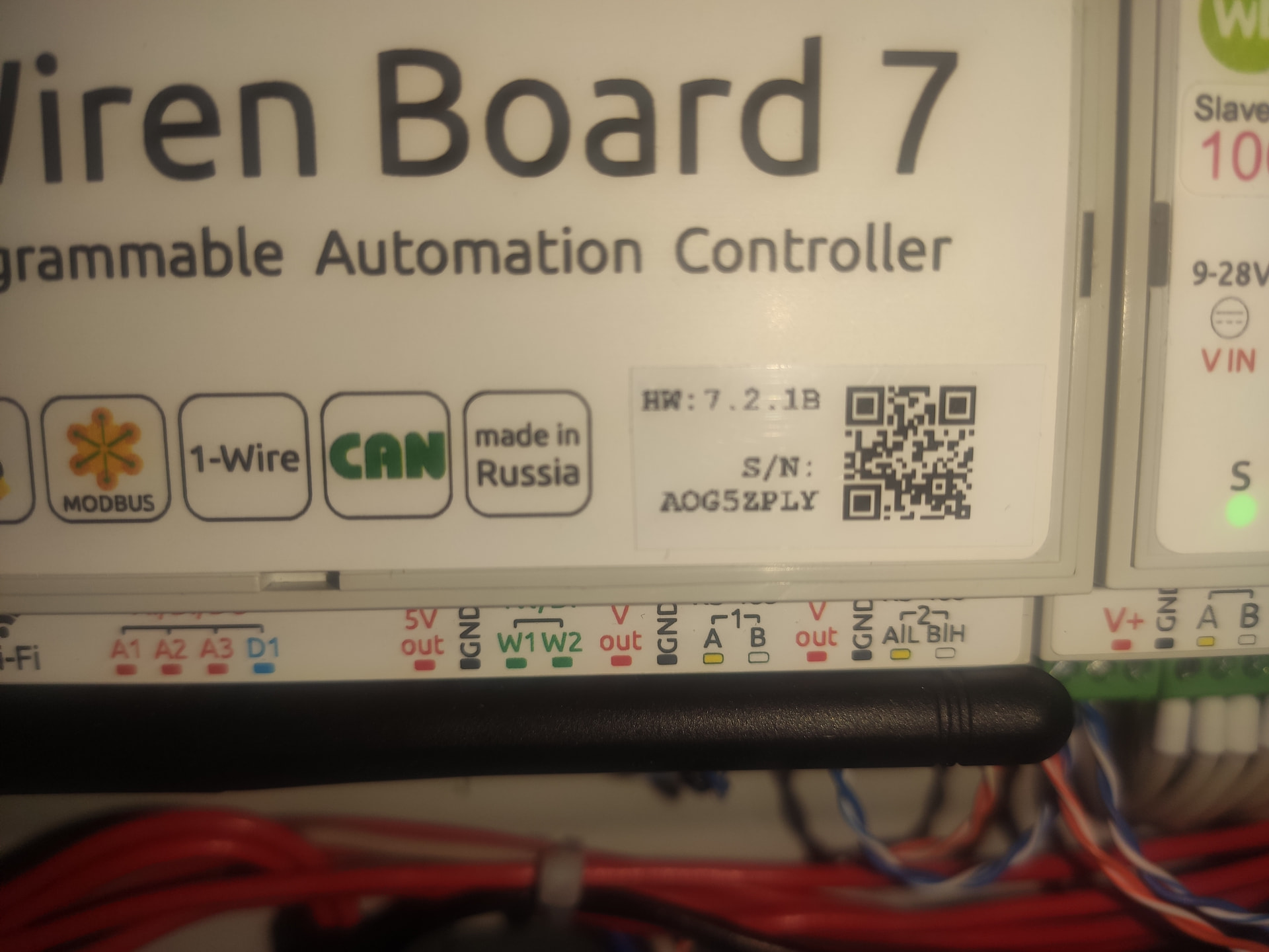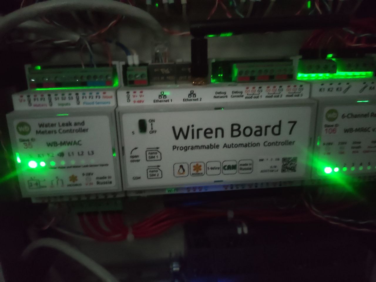 Горит только зеленая лампочка внутри. Питается от HDR-30-24, Напряжение на клемме питания WB7 22V, модули, подключенные к тому же БП работают. Перезагружать переключателем пробовал и автомат включал\выключал. Никаких скачков напряжения не было, ничего не делал. Точную версию прошивки не помню, обновлял где-то полгода назад.