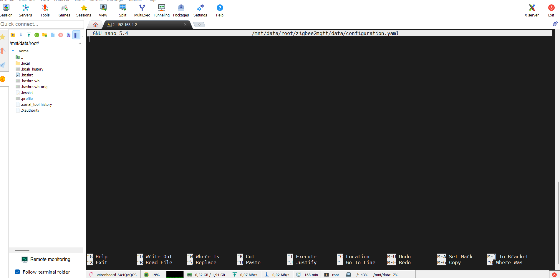 root@wirenboard-AX4QAQCS:~# nano /mnt/data/root/zigbee2mqtt/data/configuration.yaml