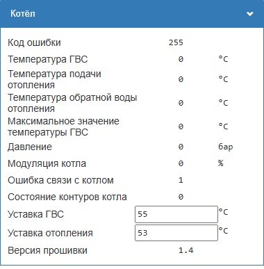 Здравствуйте. Как я поступил: снял разъем RS-485-1. Включил режим отладки. В консоли ввел указанную команду. Отключил режим отладки. Вернул разъем RS-485-1 на место. Через WinSCP выгрузил файл и отправляю его Вам. Если я что-то не так сделал, подскажите поточнее как надо было верно сделать. Я еще только учусь. После указанных действий окно котла стало таким (до указанных действий все контролы были красными, но вроде как показывали верно и , кмк, ошибки связи с котлом не было (был 0)