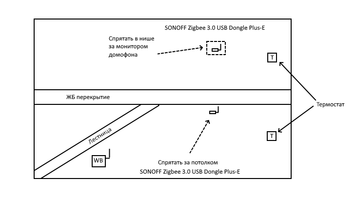 Однако, такой вариант крайне нежелателен. Его можно применить, если расширить текущую Zigbee сеть маршрутизаторами невозможно и зона второго этажа изолирована.