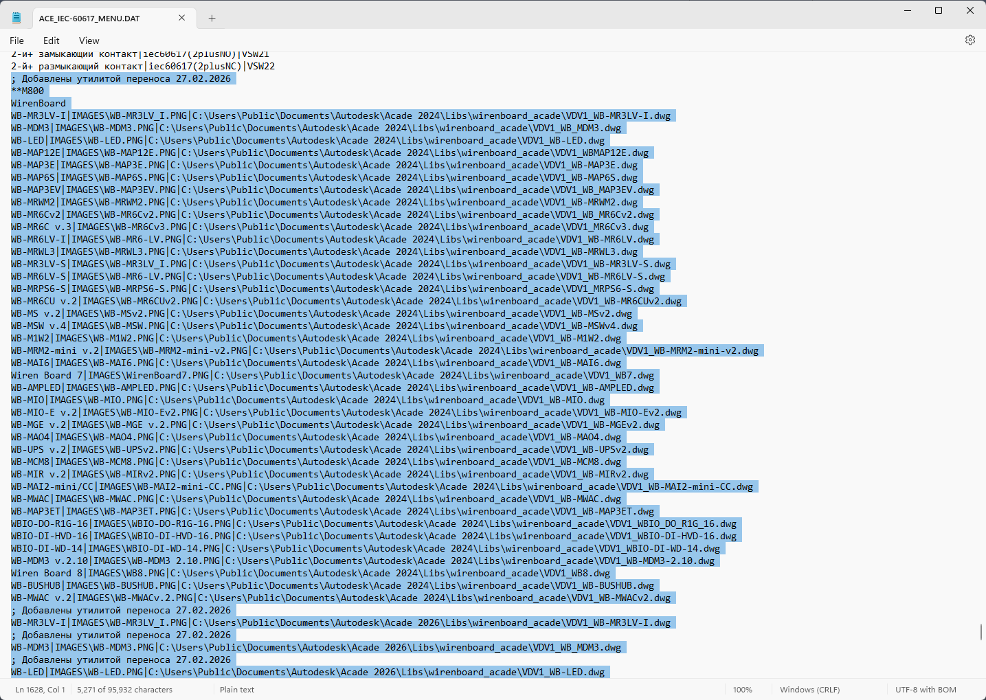 C:\Users<Имя_Пользователя>\AppData\Roaming\Autodesk\AutoCAD Electrical 2025\R25.1\rus\Support\ACE_IEC-60617_MENU.DAT - Внизу файла найдите строки, которые относятся к 2024 версии и к 2025 (у меня на скриншоте 2026), выделите и удалите их, сохраните файл.