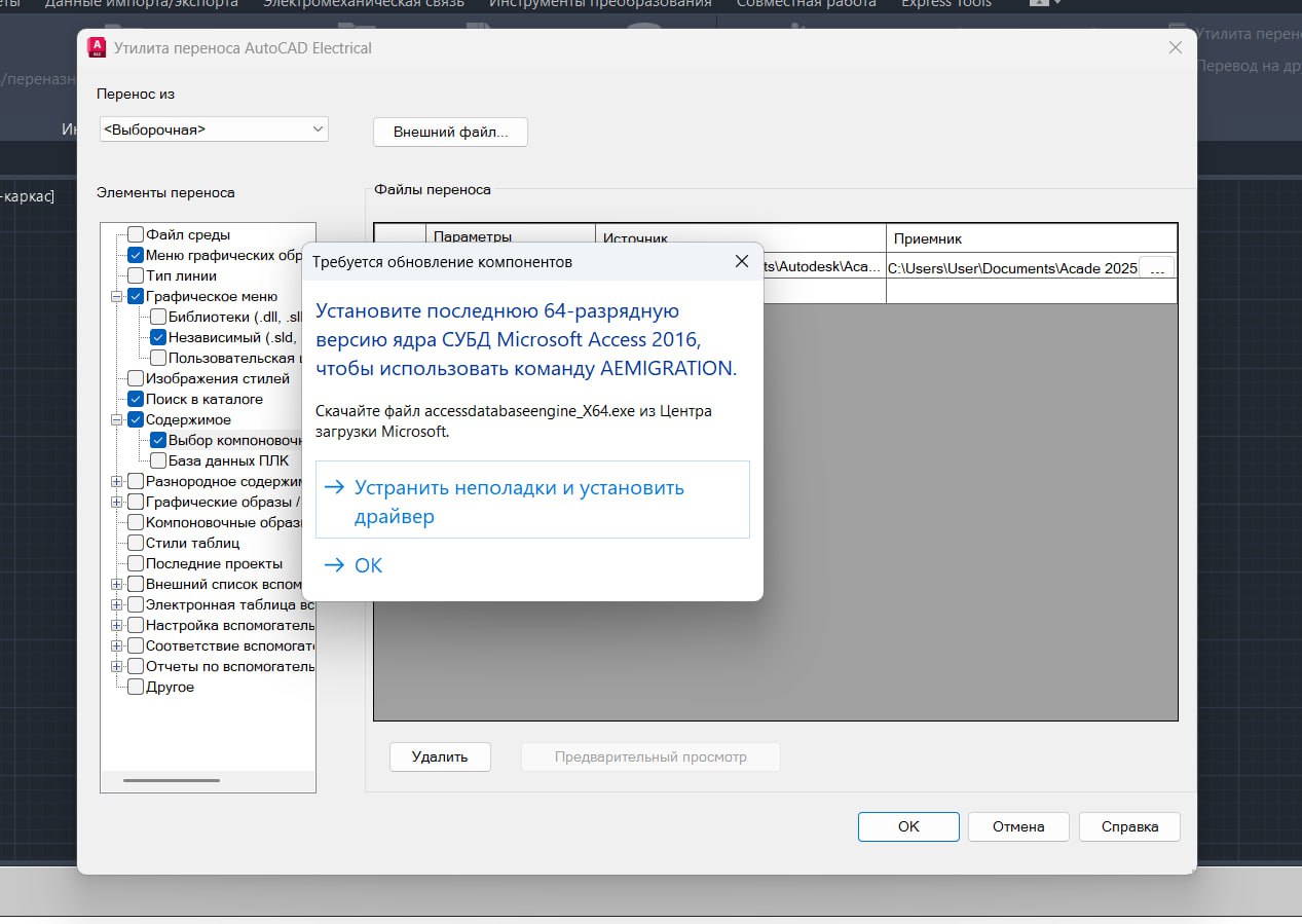 (этот абзац только для информации, делать ничего не нужно) Предположительно, если вы следовали инструкции, то в п.6 Меню графических образов в качестве файла-приемника указали AEC_IEC_MENU.DAT, а по умолчанию используется ACE_IEC-60617_MENU.DAT, поэтому образов нет в меню. Этот файл настраивается в свойствах проекта (ПКМ по проекту → Свойства → Файл графического меню). Но это не поможет, потому что вы использовали файлы для 2024 версии, а в них другие пути.