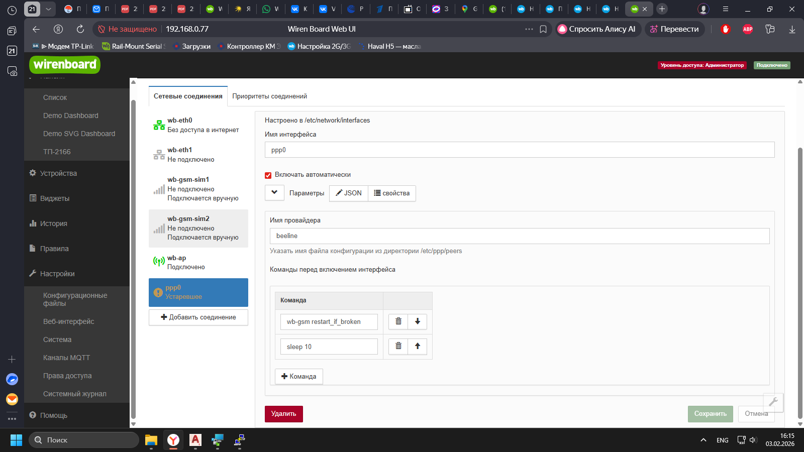 ModemManager использовать для подключения не получается. когда вставляю новую симку первый раз в модем, делаю настройку в конфиг файлах GSM-соединение для wb-gsm-sim1, первый раз всё прекрасно запускается, работает до первого отключения контроллера или перезагрузки, после этого модем постоянно пытается соединится но ни чего не выходит, поэтому используем старый способ, через РРР0.