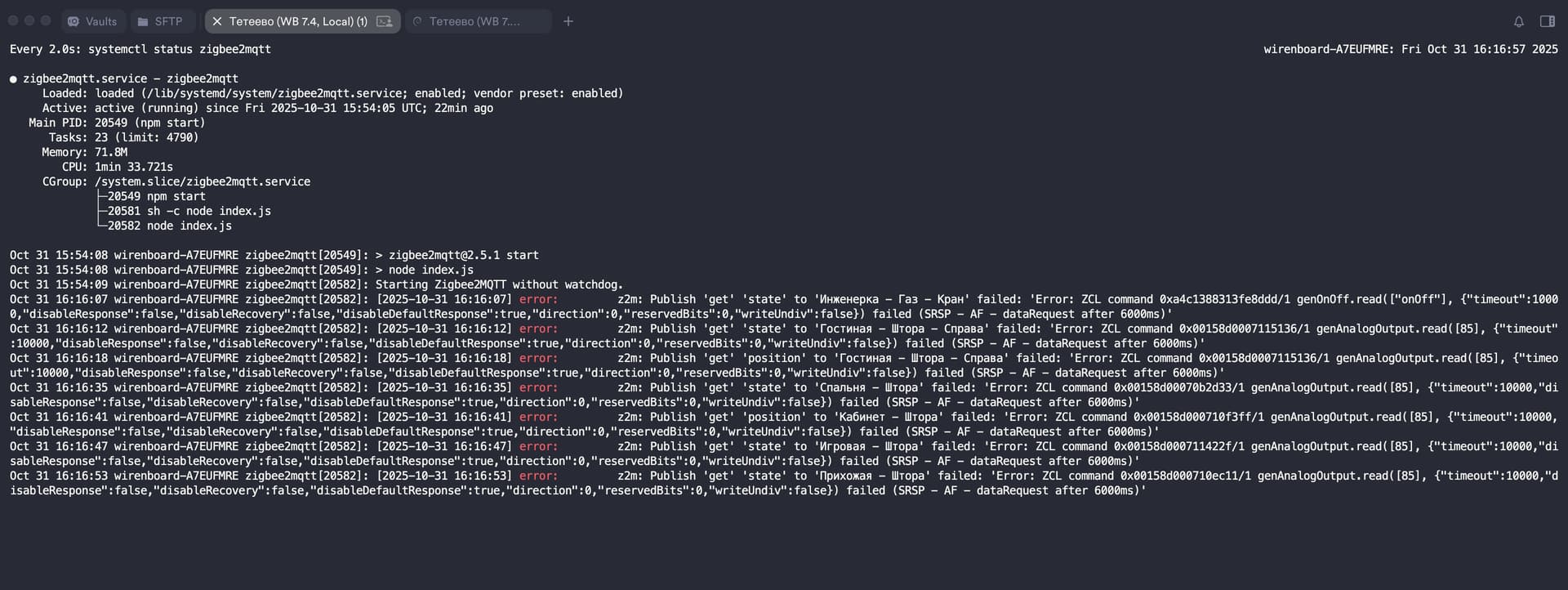 wb-cc2652p-flasher 4 /mnt/data/CC1352P2_CC2652P_launchpad_coordinator_20250321.hex. - Обновлены все периферийные устройства через